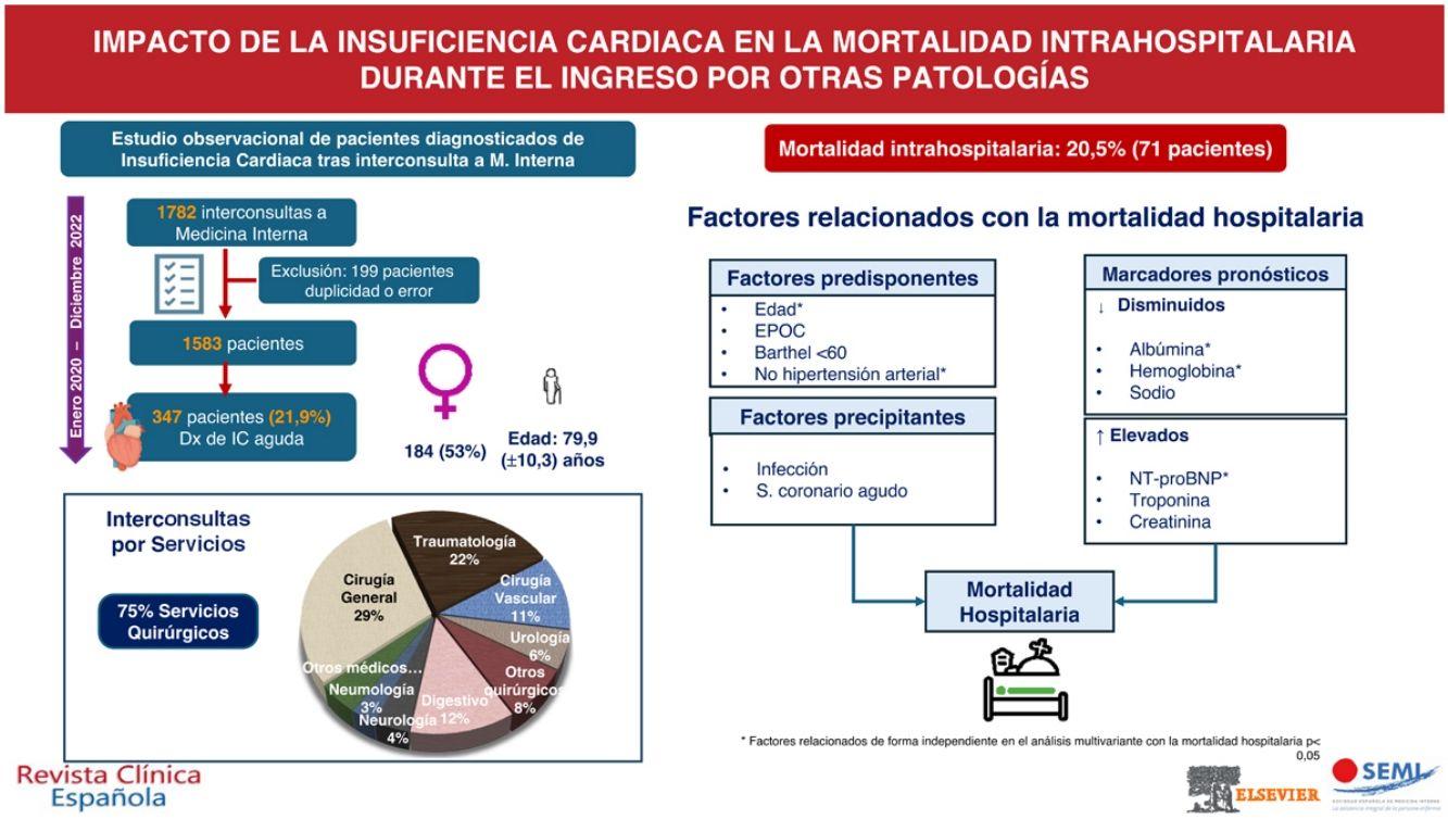 Material y métodosEstudio observacional que incluyó a pacientes diagnosticados de ICA tras interconsulta a MI (2020–2022). Se recogieron características demográficas y clínicas, motivo de ingreso, tipo de cardiopatía, factores desencadenantes, mortalidad intrahospitalaria y sus factores asociados.