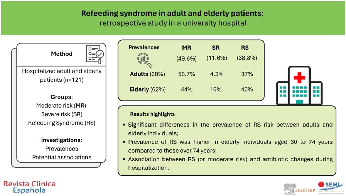 Estimar la prevalencia de pacientes adultos y ancianos en riesgo o diagnosticados con síndrome de realimentación (SR), así como explorar posibles asociaciones con la edad, comorbilidades, uso de antibióticos y desenlaces clínicos durante la hospitalización.