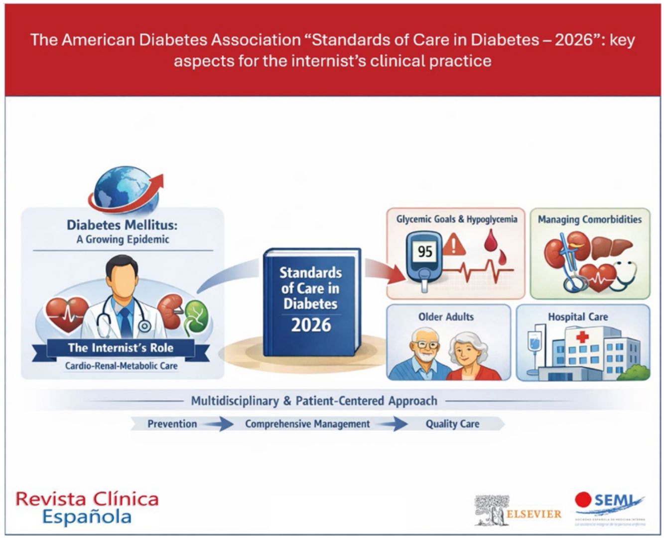 La diabetes mellitus es una enfermedad crónica compleja que ha emergido como una epidemia en los últimos años. Requiere un manejo personalizado usando estrategias centradas en reducir eventos adversos más allá del manejo de la hiperglucemia. Debido a su naturaleza multisistémica, implicaciones cardio-reno-metabólicas y comorbilidades asociadas, el internista es clave para manejarla. Los Estándares de Atención en Diabetes de la Asociación Americana de Diabetes representan la guía internacional de referencia. El objetivo de esta revisión es aportar una actualización práctica de algunos puntos de interés para internistas de los Estándares de Atención en Diabetes-2026, recientemente publicados. Hemos destacado aspectos como objetivos glucémicos e hipoglucemia, abordaje de comorbilidades, manejo de pacientes de edad avanzada y cuidado de diabetes hospitalaria. A través de coordinación del cuidado multidisciplinar e integración de estrategias preventivas y terapéuticas, los internistas somos esenciales para el manejo de calidad centrado en el paciente con diabetes.