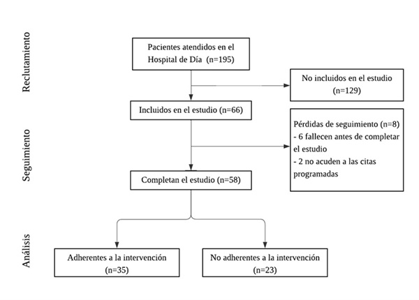 Métodos: Se realizó un estudio observacional, analítico y prospectivo en una cohorte de 66 pacientes con IC crónica, atendidos en el Hospital de Día del Hospital Universitario Puerta de Hierro durante 7 meses. Se valoraron la calidad de vida mediante el Kansas City Cardiomyopathy Questionnaire (KCCQ), la masa muscular mediante índice de masa muscular esquelética (IMME, medido mediante bioimpedanciometría), y biomarcadores como NT-proBNP y Ca-125. Se compararon los resultados entre pacientes adherentes y no adherentes.
