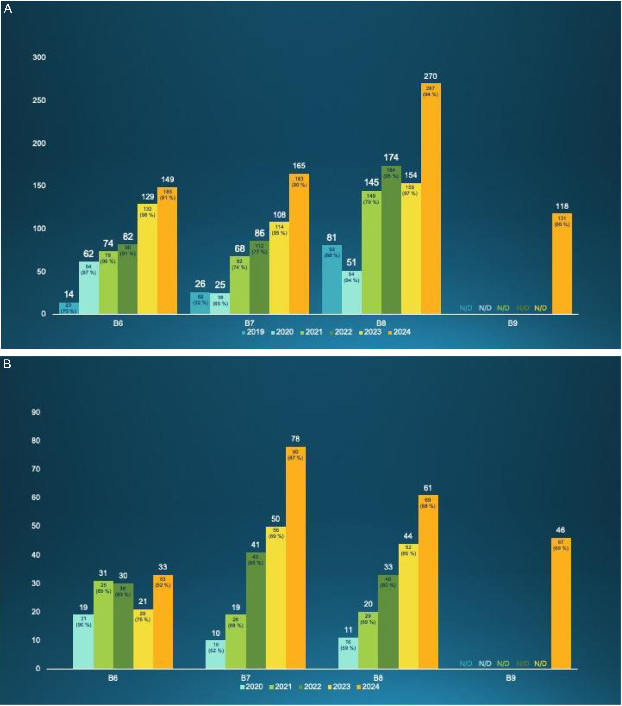 Se describe un aumento muy relevante en el número de acreditaciones (fig. 1AyB). En el caso del PTU, con respecto a 2019, se ha producido un incremento en 2024 del 1.064% (149 acreditaciones) en la Comisión B6, del 635% (165 acreditaciones) en la Comisión B7 y del 479% (378 acreditaciones) en las Comisiones B8 y B9. En el caso de CU, con respecto a 2020, se ha producido un incremento en 2024 del 73% (33 acreditaciones) en la Comisión B6, del 780% (78 acreditaciones) en la Comisión B7 y del 972% (107 acreditaciones) en las Comisiones B8 y B9. Tan destacable como el aumento del número de acreditaciones es el aumento del número de solicitudes y del porcentaje de acreditaciones sobre el total de solicitudes, evidenciando —ahora sí— un mayor interés por la implicación con la formación universitaria. Siendo unos cambios muy significativos, su número resulta aún insuficiente para paliar el déficit de profesorado existente, que se inició en 2010.