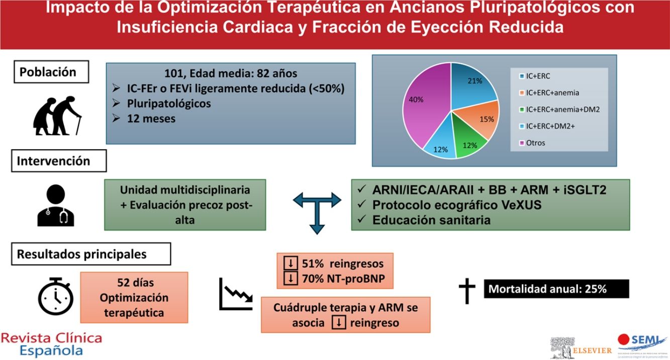 Se evalúa el impacto de una unidad especializada sobre la reducción de reingresos por insuficiencia cardíaca (IC) en pacientes ancianos pluripatológicos con IC-FEr (FEVi <40%) o ligeramente reducida (FEVi 40-50%), considerando distintos niveles de optimización farmacológica.