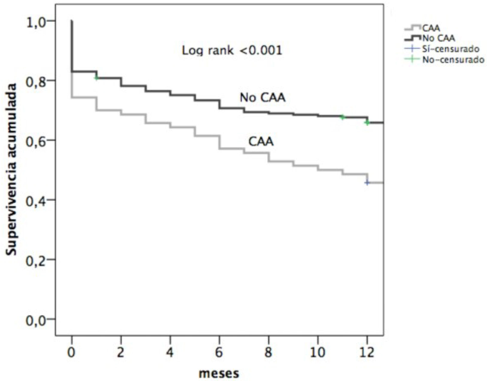 ResultadosEl 51% de los pacientes presentaba CAA. La edad >65años, la dislipemia y el tabaquismo fueron predictores independientes (p<0,05). La CAA se asoció significativamente con mayor prevalencia de eventos cardiovasculares: ictus (23,3% vs. 13,3%; OR: 1,9, IC95%: 1,07-3,6), síndrome coronario agudo (23,3% vs. 8,5%; OR: 3,2, IC95%: 1,6-6,4) y enfermedad arterial periférica (20,9% vs. 7,3%; OR: 3,3, IC95%: 1,6-6,9). A los 12meses, los pacientes con CAA presentaron mayor incidencia de nuevos eventos cardiovasculares (22,5% vs. 10,9%; OR: 2,3, IC95%: 1,2-4,9; p=0,007). Aunque la supervivencia global fue menor en este grupo, solo la edad y la insuficiencia renal crónica fueron predictores independientes de mortalidad.