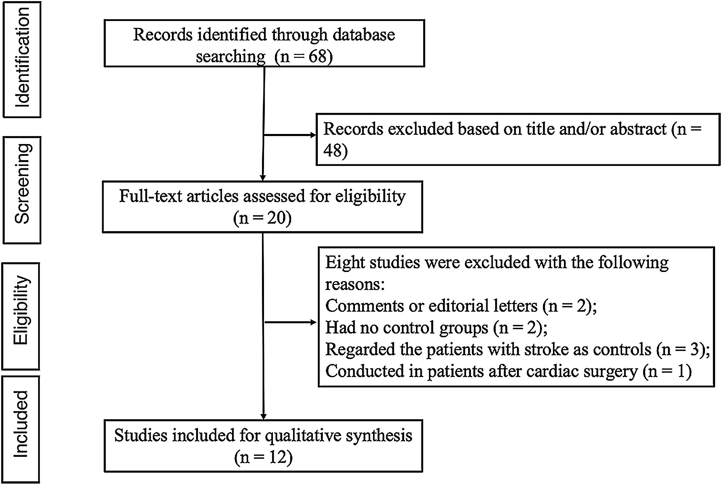 Our meta-analysis included 12 studies. In the meta-analysis, five studies (9418 retinal artery occlusion [RAO] patients and 26,116,452 controls) showed a significantly higher prevalence of AF in RAO patients (odds ratio [OR]=1.74, 95% confidence interval [CI] 1.15–2.63, P=0.009, I2=94%). Four studies (1622 retinal vein occlusion [RVO] patients and 92,910 controls) indicated a higher prevalence of AF in RVO patients (OR=2.28, 95% CI 1.93–2.69, P<0.00001, I2=0%). For follow-up incidence, two studies (806 RAO patients and 7840 controls) reported a higher rate of AF detection in RAO patients (hazard ratios [HR]=1.60, 95% CI 1.25–2.04, P=0.0002, I2=0%). Similarly, two studies (2330 RVO patients and 8641 RVO controls) revealed a higher rate of AF detection in RVO patients (HR=1.25, 95% CI 1.04–1.51, P=0.02, I2=49%).