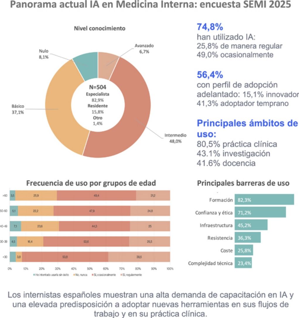 ConclusionsSpanish internists have varying levels of knowledge about artificial intelligence, with younger doctors having greater knowledge, and its main current use is in clinical practice. Lack of training is the main barrier to its incorporation, despite high demand for training and a general willingness to adopt it, highlighting the need for training programmes and strategies for integrating AI into internal medicine.