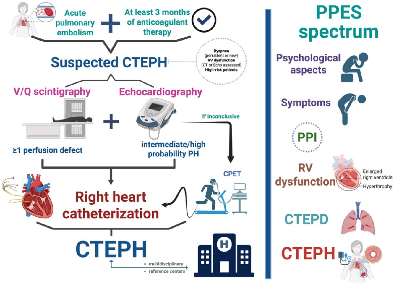 Post-pulmonary embolism syndrome (PPES) describes the spectrum of long-term sequelae following acute pulmonary embolism (PE), including persistent dyspnea, exercise intolerance, and psychological impairment, often in the absence of pulmonary hypertension (PH) or right ventricular (RV) abnormalities. Persistent RV dysfunction occurs in up to 18% of patients beyond three months and is associated with recurrent venous thromboembolism (VTE) and PE-related mortality. The FOCUS study introduced the concept of post-PE impairment (PPI), defined by a combination of echocardiographic RV dysfunction and clinical or functional deterioration, which predicted higher mortality, rehospitalization rates, and impaired quality of life. Chronic thromboembolic pulmonary disease (CTEPD) refers to symptomatic patients with residual perfusion defects but without PH. In contrast, chronic thromboembolic pulmonary hypertension (CTEPH) is defined by pre-capillary PH in the presence of residual obstruction, with a cumulative incidence of 0.5–4% within two years. Prognosis in CTEPH is driven primarily by RV dysfunction, but advances in multimodal therapies—surgical, interventional, and pharmacological—have improved survival, underscoring the importance of early recognition and systematic follow-up.