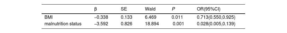 malnutrition status  −3.592  0.826  18.894  <0.001  0.028(0.005,0.139)