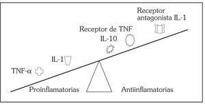 Fig. 1. Disbalance de citocinas proinflamatorias/antiinflamatorias. La artritis reumatoide es una enfermedad en la que existe un disbalance a favor de las citocinas proinflamatorias. Adaptada de Feldman M, et al 4.