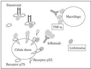 Existen en la actualidad tres fármacos en el mercado capaces de inhibir la acción del TNF con dos mecanismos diferentes (fig. 2): anticuerpos monoclonales que se unen al TNF-α (infliximab y adalimumab) y receptor soluble (etanercept).