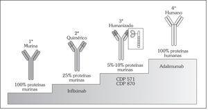 1) Anticuerpos monoclonales: son específicos contra TNF-α, tanto en forma soluble como adherido a la membrana de células T; al tratarse de anticuerpos pueden inducir lisis de estas células. Hay dos fármacos comercializados, infliximab y adalimumab. El primero es un anticuerpo quimérico de origen murino, es decir, aproximadamente un 25% de sus aminoácidos son de origen murino. Adalimumab tiene un 100% de origen humano, con una menor capacidad antigénica. La vía de administración es intravenosa en el caso de infliximab y subcutánea para adalimumab.