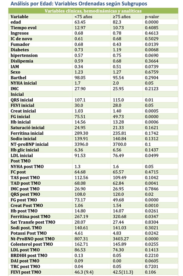 Resultados: La media de edad fue de 68 ± 12,1 años, con predominio masculino (75%). La etiología isquémica fue la más prevalente (41,2%), y las comorbilidades más frecuentes fueron hipertensión arterial (62%) y diabetes mellitus (62%). La fracción de eyección ventricular izquierda (FEVI) inicial fue de 31,4 ± 7,2%. El 5,3% presentó un índice de Barthel < 80 y el índice de comorbilidad de Charlson ajustado por edad fue de 7 (RIC: 5-8). La clase funcional NYHA basal fue de 2 (RIC: 1-2). Los pacientes de edad avanzada (≥ 75 años) presentaron una mayor carga comórbida, con tendencia a un mayor índice de Charlson, peor situación funcional basal con clase funcional de NYHA más elevada y ligera reducción de la FEVI, aunque estas diferencias no siempre alcanzaron significación estadística (tabla 1). La prescripción farmacológica fue similar entre grupos; sin embargo, se observó una tendencia a menor intensidad terapéutica en el grupo ≥ 75 años, reflejada en dosis medias inferiores de betabloqueantes (2,68 vs. 2,99) y antagonistas del receptor mineralocorticoide (2,55 vs. 2,92), probablemente asociada a la presencia de hipotensión, deterioro renal o polifarmacia. No se observaron diferencias relevantes en el uso de ARNI ni de iSGLT2. En cuanto a la respuesta clínica y funcional pos-TMO, se evidenciaron diferencias significativas entre los grupos en parámetros como clase funcional NYHA, niveles de NT-proBNP pos-TMO y duración del QRS, Sin embargo no se observaron diferencia en cuanto a la recuperación de la FEVI ni requerimientos de diuréticos de asa. Durante el seguimiento a medio plazo, los pacientes ≥ 75 años presentaron una mayor tasa de reingresos por insuficiencia cardiaca (0,5 vs. 0,09 ingresos por paciente; p = 0,0039) y una tendencia no significativa hacia mayor mortalidad (12,5 vs. 4,1%; p = 0,15). Los reingresos por cualquier causa también fueron más frecuentes en el grupo de mayor edad, sin alcanzar diferencias estadísticamente significativas.