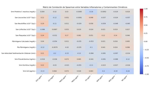 Métodos: Se realizó un estudio observacional analítico con datos diarios de contaminantes (SO2, CO, PM25, PM10, O3, NOX, NO2, NO) y biomarcadores inflamatorios (proteína C reactiva, leucocitos, neutrófilos, linfocitos, plaquetas, fibrinógeno, velocidad sedimentación globular, procalcitonina, ferritina, IL-6) recolectados entre enero-diciembre 2024. El análisis incluyó: 1) Correlación de Spearman entre contaminantes e inflamación; 2) Comparación (U-Mann Whitney) entre días de baja inflamación (Q25) vs. alta inflamación (Q75); y 3) Análisis de retardos mediante correlación de Spearman con desfases temporales (lag 1, 3 y 7 días) para evaluar efectos tardíos. Los análisis se ajustaron considerando p < 0,05 como significativo (con corrección de Holm-Bonferroni para comparaciones múltiples).