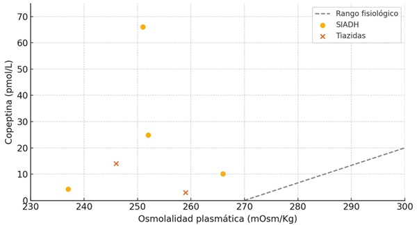 Discusión: En el SIADH la concentración de ADH se encuentra inapropiadamente alta en relación a una osmolalidad plasmática baja (ver curva ADH/osmolalidad plasmática, fig.). Aunque la osmolalidad urinaria es un valor subrogado de la ADH, en algunos casos puede estar modificada por otros factores. La copeptina es un péptido que forma parte de la molécula precursora de la ADH y es más estable que esta, por lo que su medición es más fiable.