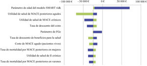 Se realizó un análisis de sensibilidad determinístico univariante (ASU) y otro probabilístico (ASP) para evaluar la influencia de la incertidumbre de los parámetros en la solidez del modelo y sus resultados. En el ASU se realizaron diferentes análisis en función de la posible variación de los parámetros más sensibles: edad media basal, parámetro de filtración glomerular estimada (FGe), tasa de descuento, costes de MACE agudos, tasas de mortalidad y valores de utilidad. Estos parámetros se modificaron en función del error estándar o suponiendo una variación de ±20% en ausencia de información relativa a variabilidad en los datos del caso base. Los resultados del ASU se representaron en un diagrama de tipo tornado.