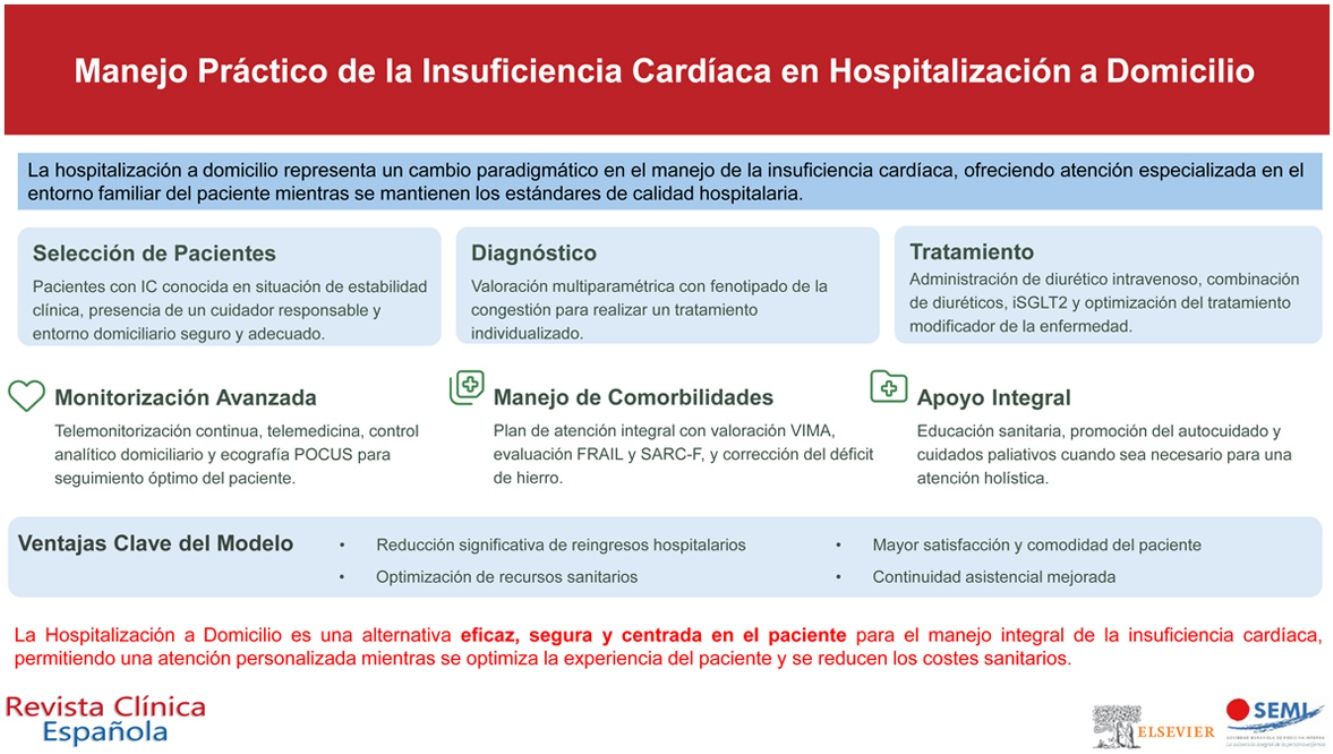La insuficiencia cardiaca (IC) es una importante causa de morbimortalidad y hospitalización en todo el mundo. La hospitalización a domicilio (HaD) surge como alternativa eficaz, mejorando la atención y optimizando recursos. Este documento, basado en un consenso de expertos, avalado por la Sociedad Española de Medicina Interna (SEMI) y la Sociedad Española de Hospitalización a Domicilio (SEHAD), establece recomendaciones prácticas para el manejo de la IC en HaD. Se describen criterios de selección de pacientes, parámetros de evaluación de congestión y pautas de tratamiento. Se destaca el uso de telemonitorización y herramientas diagnósticas como la ecografía a pie de cama. La optimización terapéutica, seguimiento clínico y educación del paciente son fundamentales. También se aborda el manejo de comorbilidades y la integración de cuidados paliativos (CP). La certificación como unidad para el manejo integral de IC y el fortalecimiento de la colaboración interdisciplinar son claves para mejorar la calidad asistencial. La HaD se presenta como una estrategia efectiva para el manejo integral de la IC, reduciendo complicaciones hospitalarias y favoreciendo una atención centrada en el paciente.