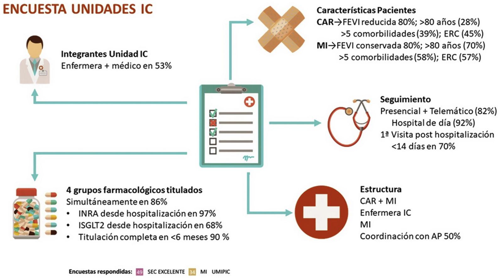 Materiales y métodosUn comité científico formado por cardiólogos e internistas elaboró una encuesta a finales de 2021, que fue enviada a 110 UIC. Setenta y tres de cardiología, acreditadas por SEC-Excelente, y 37 de medicina interna, integradas en el programa UMIPIC.