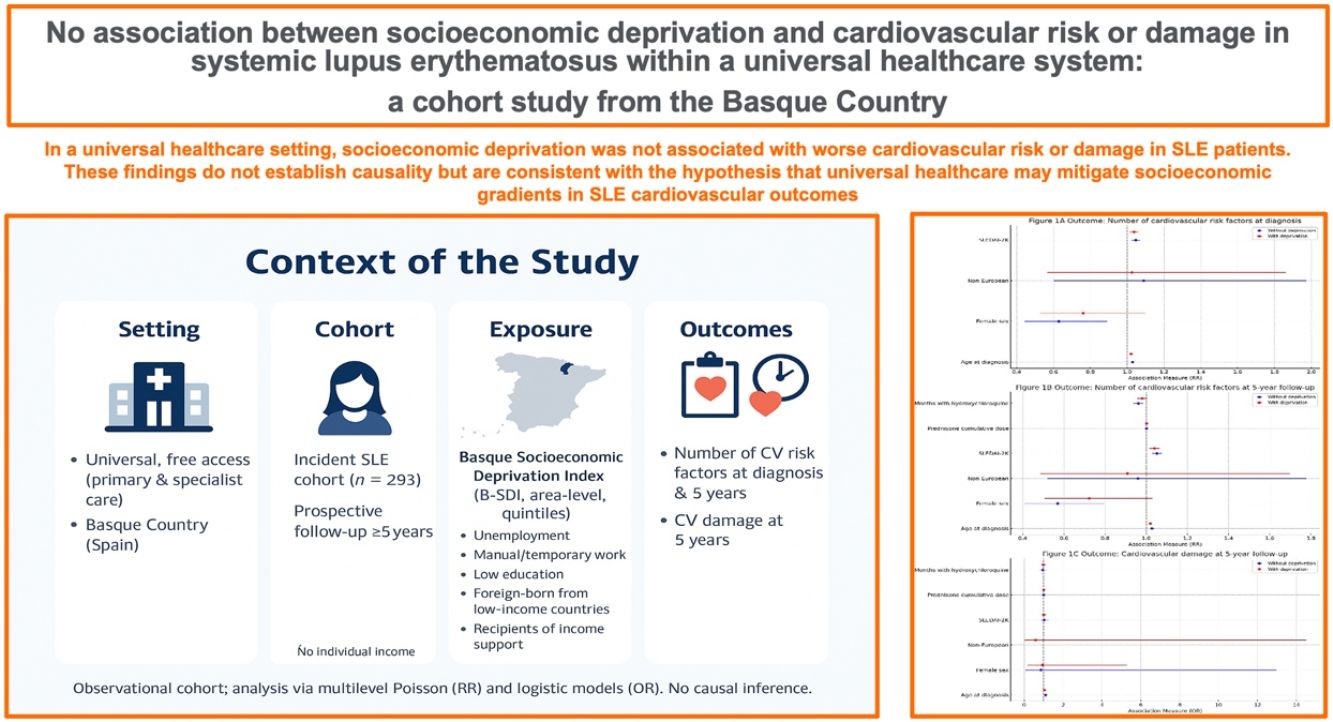 Socioeconomic deprivation is a well-recognized determinant of cardiovascular health. We evaluated its influence on cardiovascular risk and damage in patients with systemic lupus erythematosus (SLE) in the Basque Country, where universal healthcare coverage is guaranteed.