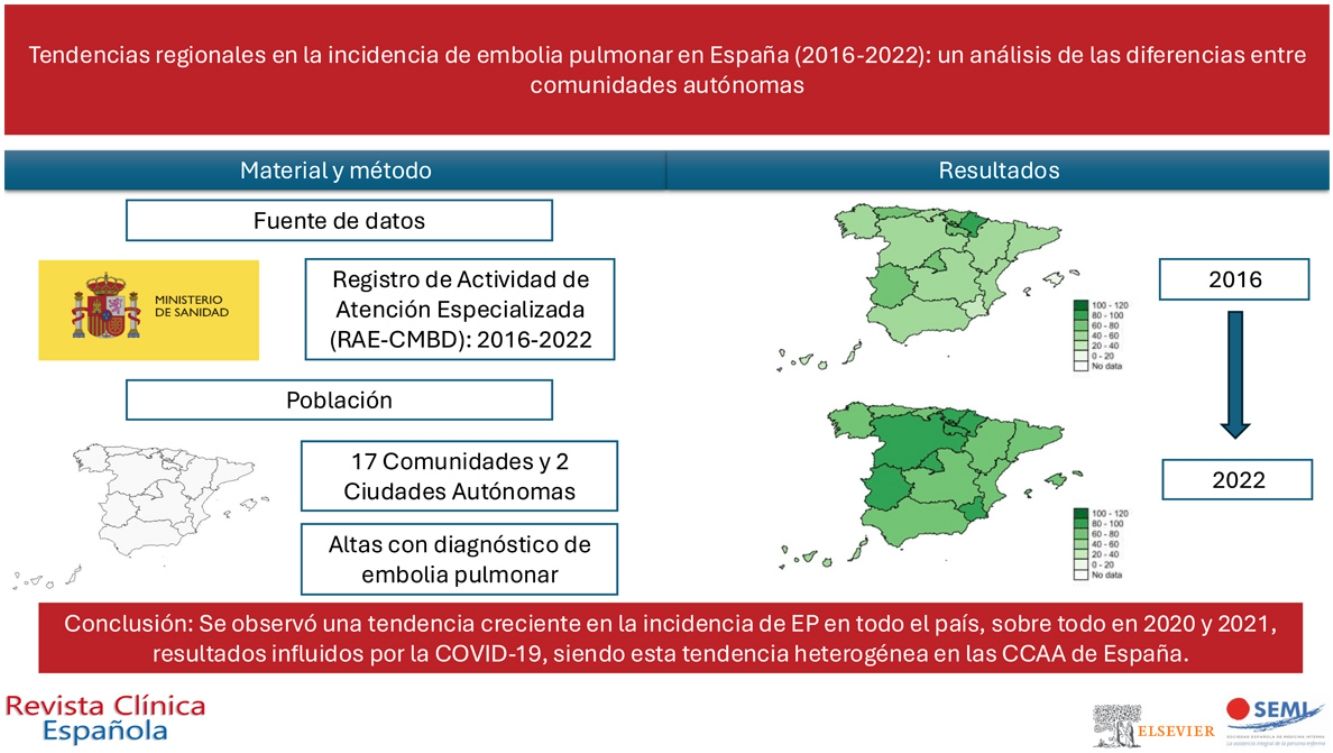 Se desconoce cuál es su distribución regional de la incidencia de embolia pulmonar (EP) dentro de España. Este estudio describe la distribución temporal y regional de la EP en España en el período 2016-2022.