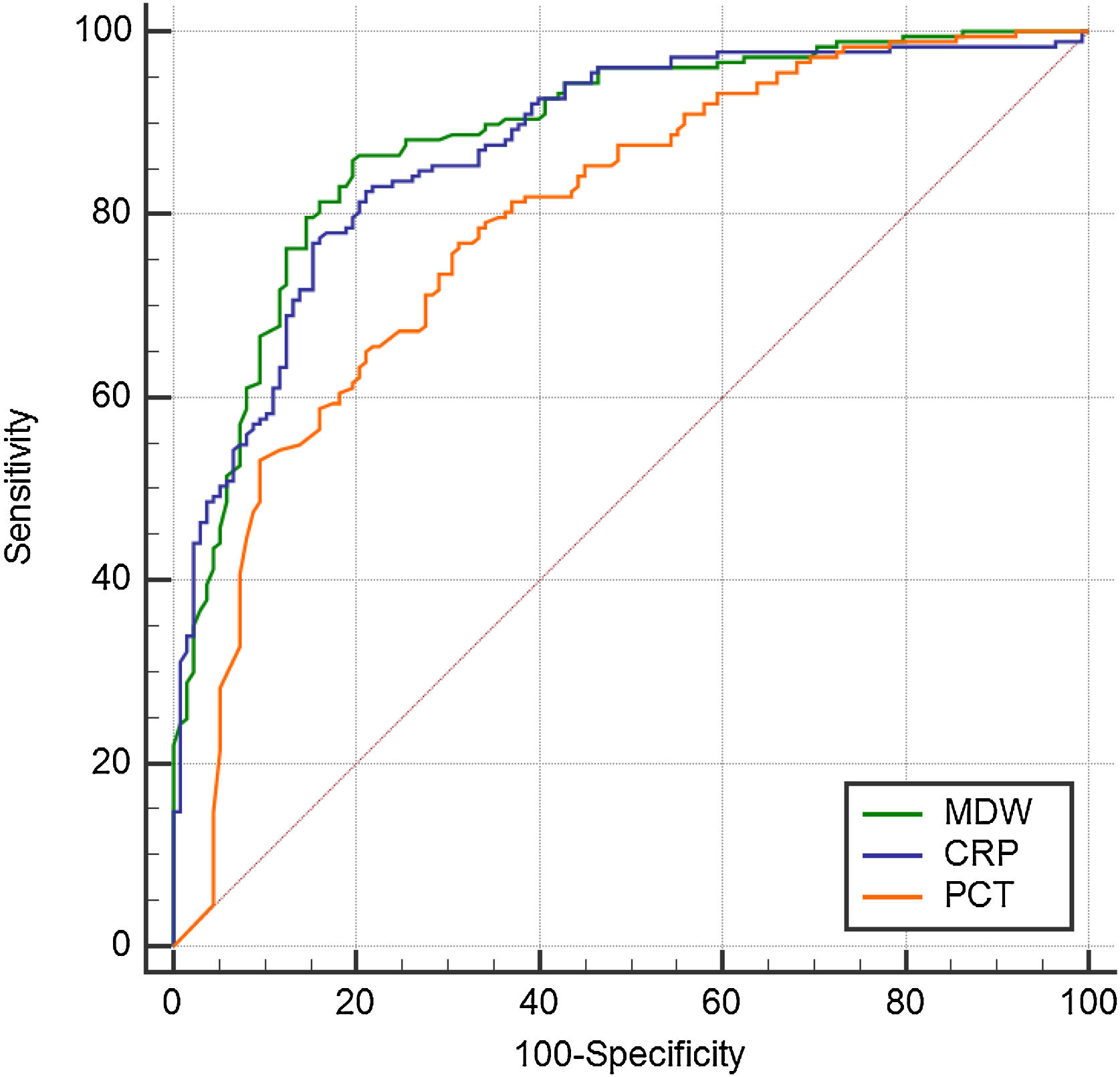 Métodosestudio de cohortes prospectivo realizado en pacientes de UCI. Se evaluaron el MDW, la PCR, la PCT y los leucocitos para el diagnóstico de sepsis en el momento del ingreso en UCI.