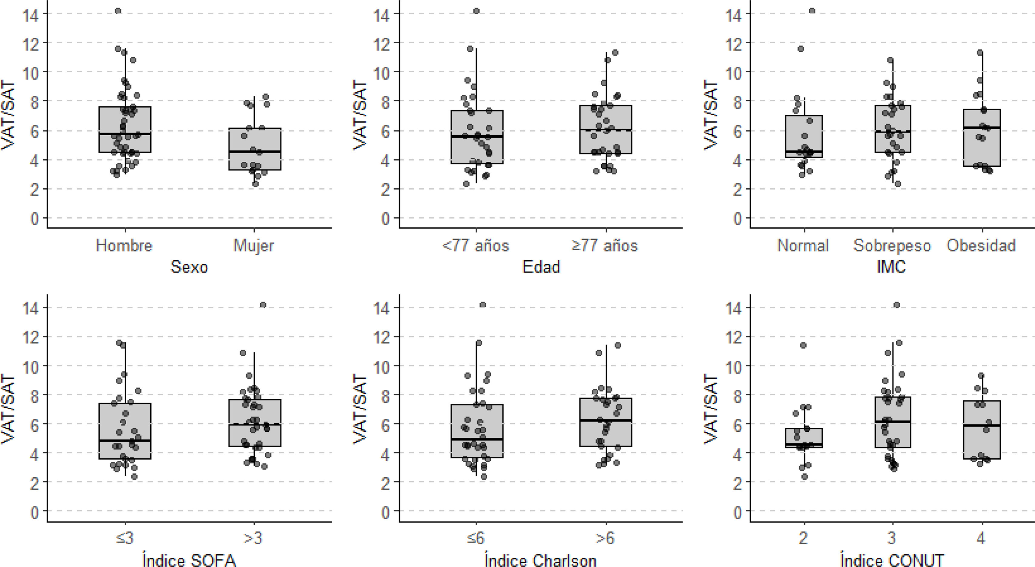 ResultadosSe incluyeron 62 pacientes. La mediana de edad fue 77 años. El riesgo de mortalidad a los 30 días del ingreso en pacientes con VAT/SAT>5,85 fue del 18%, y del 35% a los 90 días; en pacientes con VAT/SAT≤5,85, del 3 y el 6%, respectivamente. La HR ajustada de mortalidad fue de 6,6 (IC95%: 1,4 a 30,6; p=0,016). El riesgo de reingreso a los 30 días en pacientes con VAT/SAT>8,03 fue del 46%, y del 80% a los 90 días; en pacientes con VAT/SAT≤8,03, del 23 y el 30%, respectivamente. La HR de reingreso fue de 3,1 (IC95%: 1,1 a 8,5; p=0,026).
